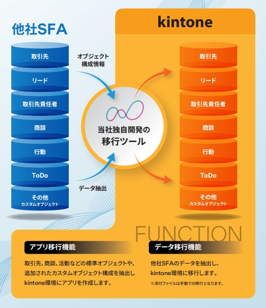 他社SFAを標準機能で利用中のユーザー向けに、短納期かつ低コストでkintoneへ移行できるサービスを提供します。