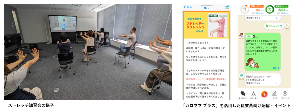 講習会後3週間、Wellmiraが開発・運営するAI健康アプリ「カロママ プラス」を活用し、ストレッチや運動などの健康行動でポイントが貯まるイベントを実施し、ストレッチなど健康行動の継続・定着化を図りました。 その結果、「施策実施後、ストレッチなど身体を動かす機会が増えた」と回答した従業員は60%以上でした。今後も取り組みを継続し、2026年中に、肩こり・眼精疲労解消のために身体を動かすことが習慣化した従業員を80%以上に引き上げることを目指します。