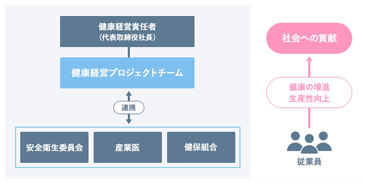 社長を健康経営責任者とした「健康経営推進プロジェクトチーム」が中心となり、安全衛生委員会・産業医・健保組合と連携して、社員の健康維持・増進を支援する施策を推進しています。<目標とする指標について>
